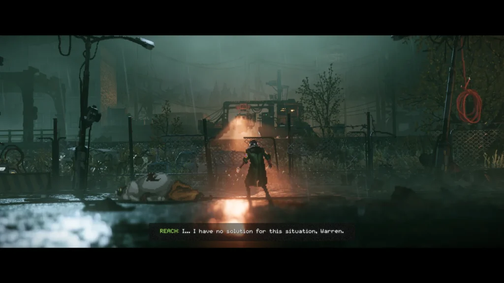 The first thing you’ll notice is the atmosphere, it’s gorgeous. The lighting is exceptionally well done, adding depth and subtle warmth to the otherwise dark foreground. You play as R.E.A.C.H., an AI trapped in a human body, navigating a post-apocalyptic version of 1980s America shaped by nuclear catastrophe. As you explore, you gradually uncover the mystery behind your creation.